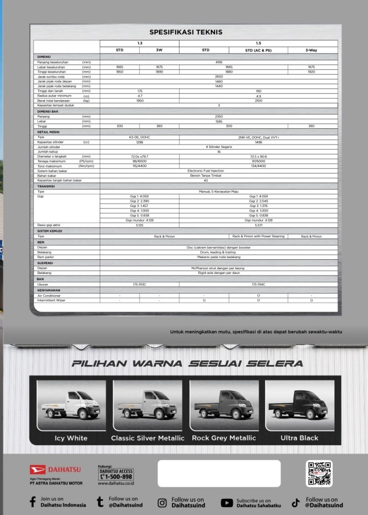 Mobil Daihatsu Gran Max Pick Up juga dilengkapi dengan kaki-kaki yang kuat dan kokoh untuk dapat menampung barang yang tentunya berjumlahdan berukuran besar.