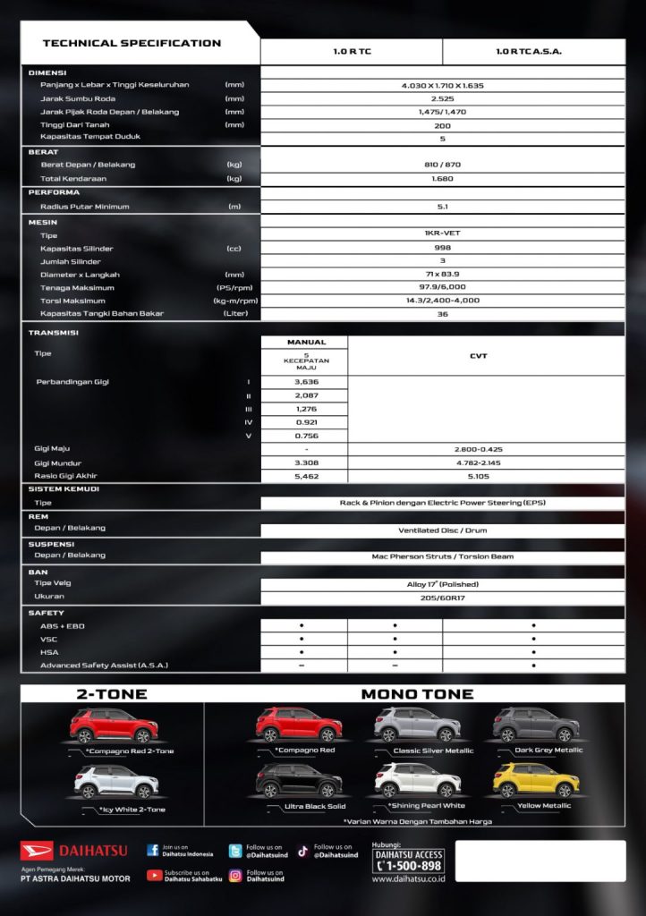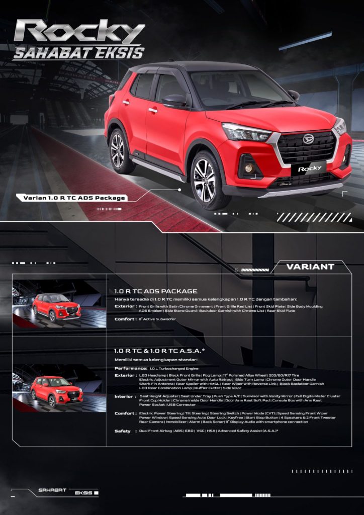 Karena terhalang pandemi, SUV kompak ini baru diperkenalkan di Indonesia pada 2021. Masuk ke Indonesia, Rocky ditawarkan dalam dua varian mesin yakni 1.0-L turbo dan 1.2-L Naturally Aspirated.